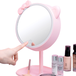 Espejo LED de gatito de dibujos animados, lámpara de luz recargable USB con estante, Marco rosa, decoración de mesa de cristal HD, espejo de maquillaje táctil inteligente para tocador